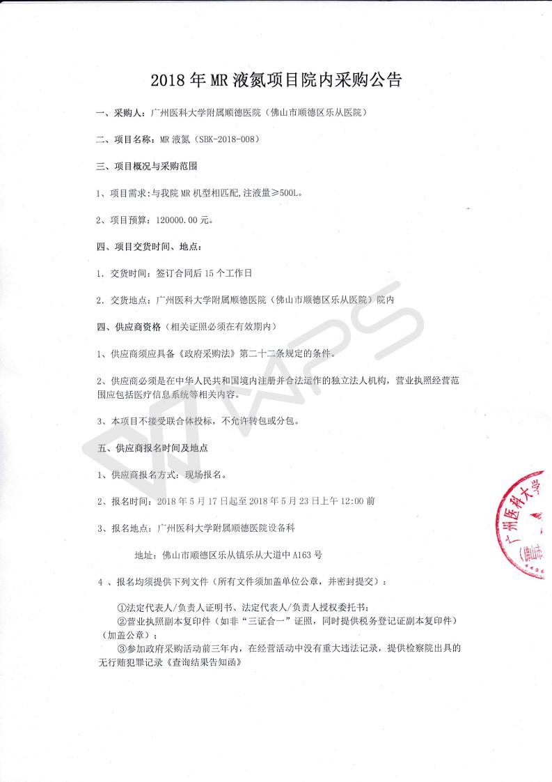 2018年MR液氮项目院内采购公告