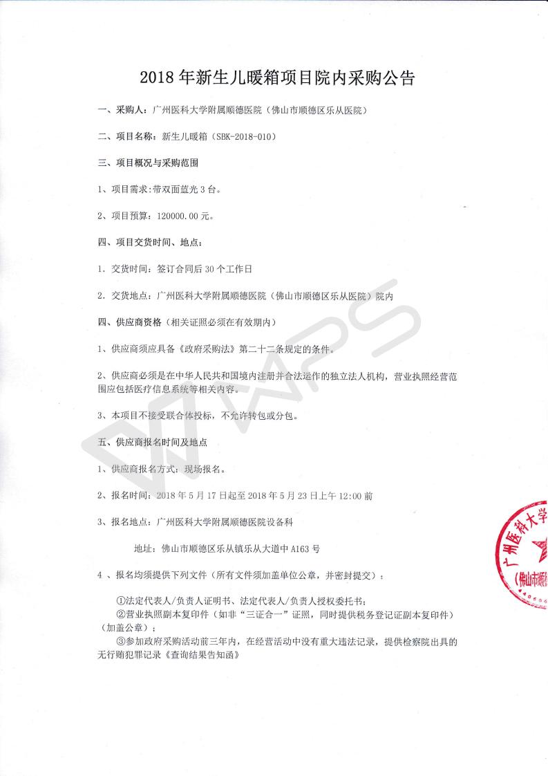 2018年新生儿暖箱项目院内采购公告