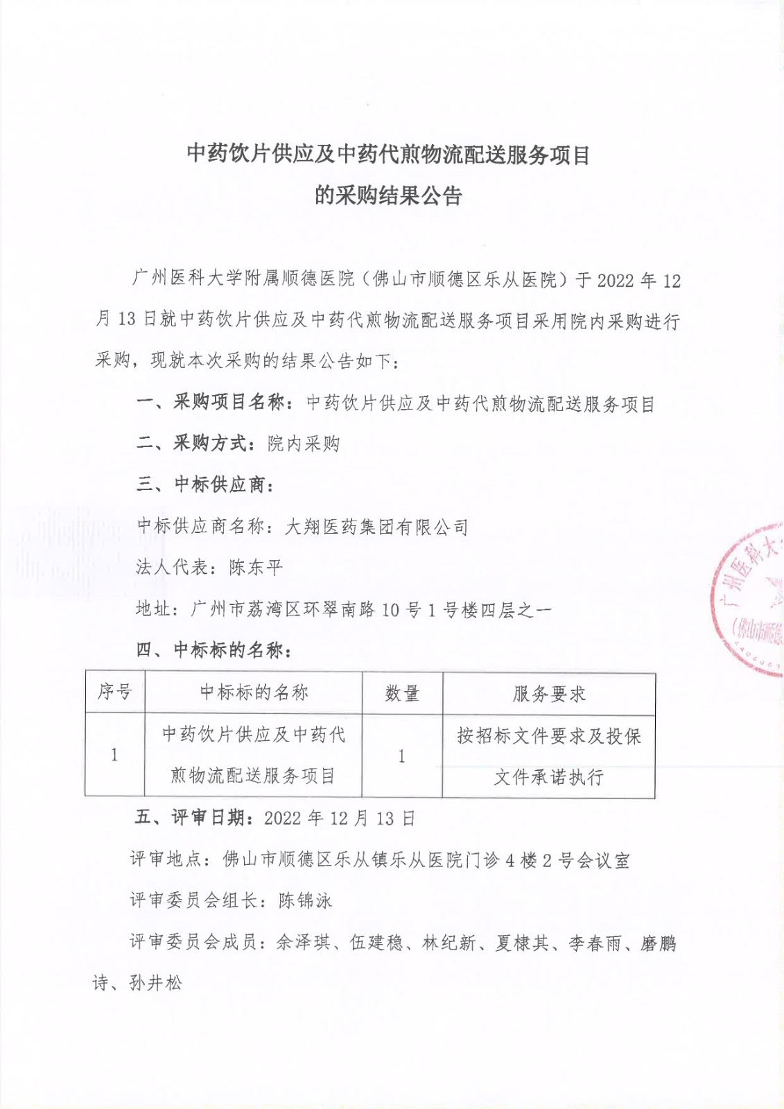 中药饮片供应及中药代煎物流配送服务项目采购结果公告