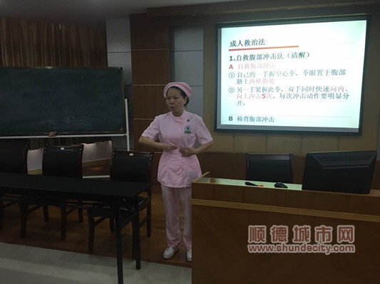 首场培训心肺复苏由该院门诊护理总监、护长曾秀芹担任主讲,她为同学们普及生命急救黄金8分钟,并演示了心肺复苏的基本操作步骤。