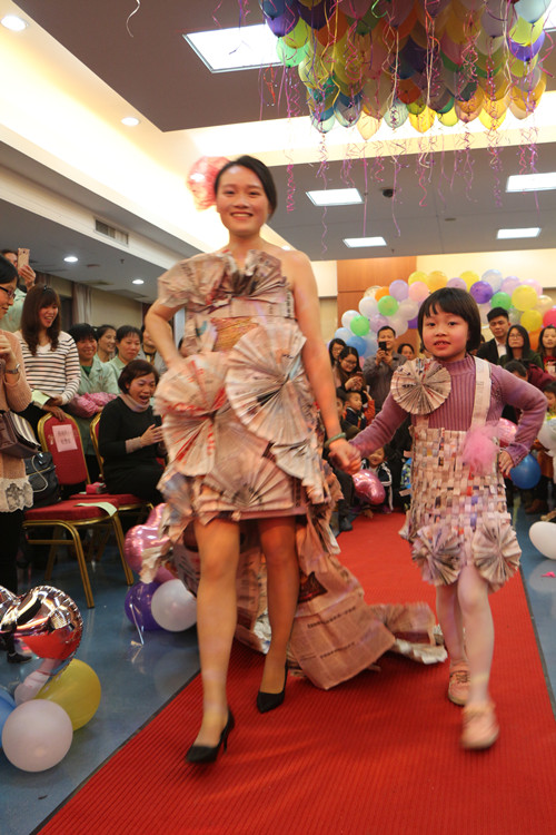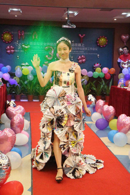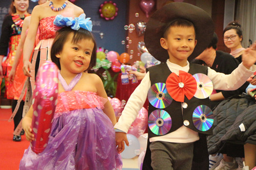 宫廷装、卡通造型、时尚服饰……伴随着欢快的音乐,大家身穿着别出心裁的靓丽时装,逐一登台亮相。制作这些服装的材料也是五花八门,塑料袋、塑料管、纸片、光盘等,无奇不有,充分体现了“践行绿色生活”这一环保理念。