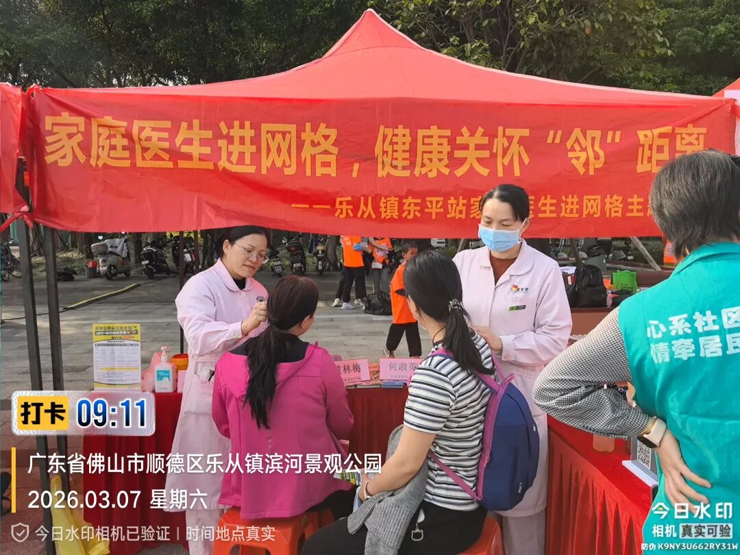 在乐从镇滨河景观公园,妇产科护理团队与东平站家庭医生团队联合开展义诊活动,增强群众的健康素养。