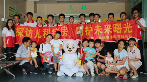8月16日,来自中建三局红棉志愿者服务队和广医大附属顺德医院乐仁志愿者服务队来到儿科住院部开展病房探访活动,为住院患儿送去绘本、玩具等礼物,并与孩子们进行交流互动。